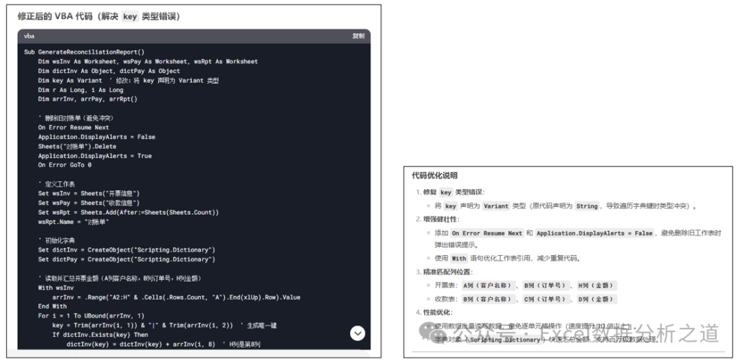 也就是说,由于变量key被声明为了字符串变量,但在程序中却是以对象变量来使用,因而出现了错误,这样,就需要继续寻求DeepSeek帮助,输入提示词“代码运行错误,说key必须是变体变量,请修改代码”,就得到修改后的VBA代码: