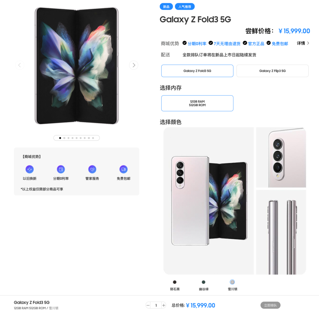 价格上,三星Galaxy Z Fold3国行先行者计划的尝鲜价格为12+512GB ¥15999,上市后陆续发货;(*尝鲜价非国行最终售价,多退少则不用补)