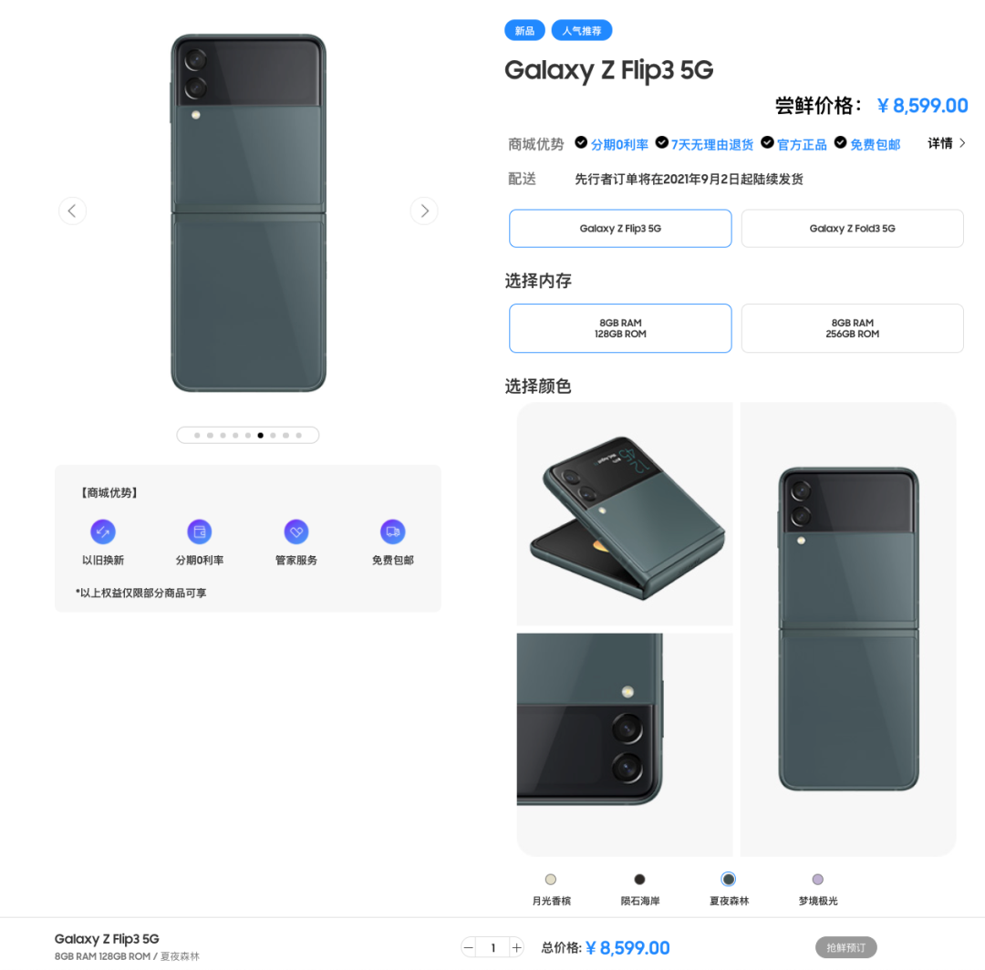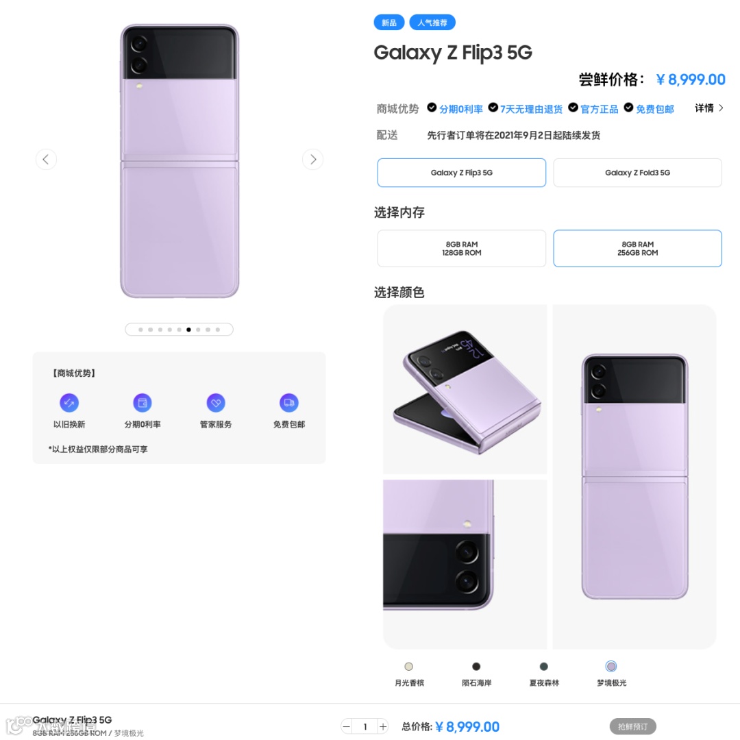 价格上,三星Galaxy Z Flip3国行先行者计划的尝鲜价格为8+128GB ¥8599,8+256GB ¥8999,预计9月2日起陆续发货;(*尝鲜价非国行最终售价,多退少则不用补。)