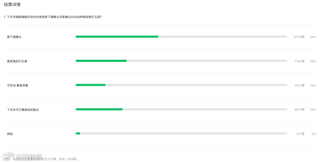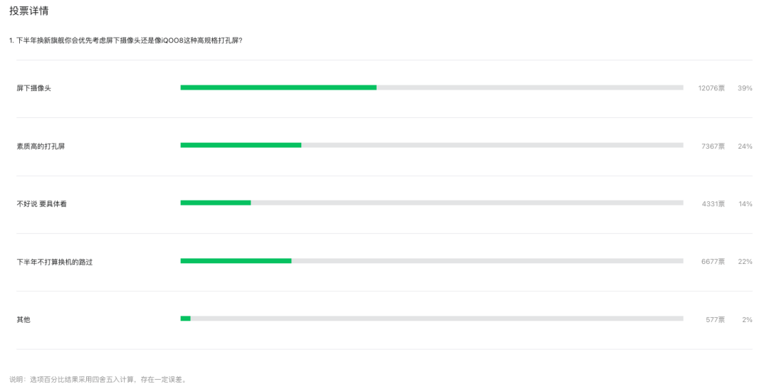 对了,再附上一个前几天做的关于「高素质打孔屏VS屏下摄像头·真全面屏,选哪个」的投票结果~ 不知道过了几天,有没有小伙伴改变投票的想法~
