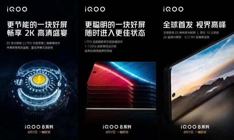 配置上,据之前官方预热,iQOO 8系列参数有:首批搭载骁龙888 Plus+LPDDR5+UFS 3.1三件套,全系配备120W有线快充;iQOO 8 Pro全球首发三星E5发光材料、2K+分辨率、120Hz屏幕刷新率、原生10亿色彩、517PPI的居中单挖孔微曲面屏;