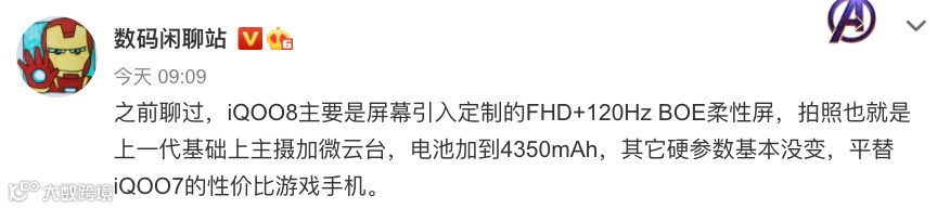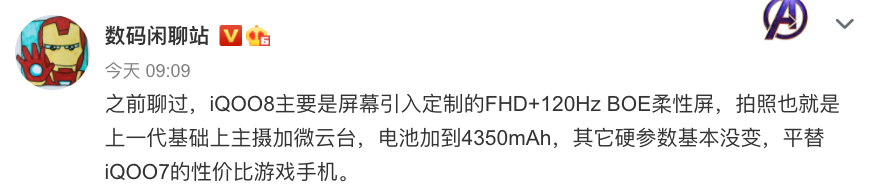 iQOO 8则定制FHD+分辨率的京东方柔性【直屏】,支持原生10bit色深、120Hz屏幕刷新率,多档高刷,4350mAh电池。还有爆料称这次iQOO 8系列还将配备无线充电。