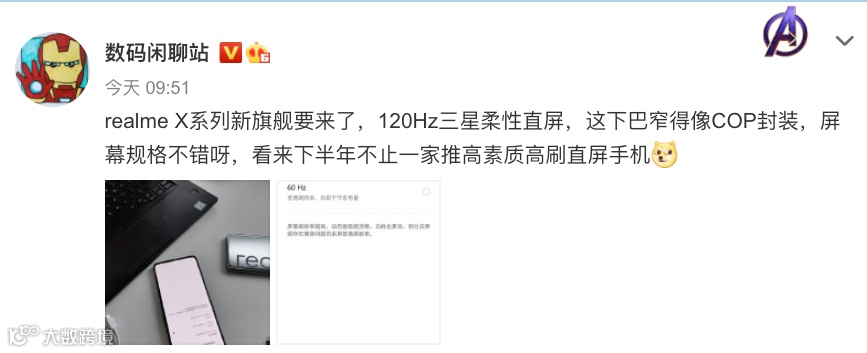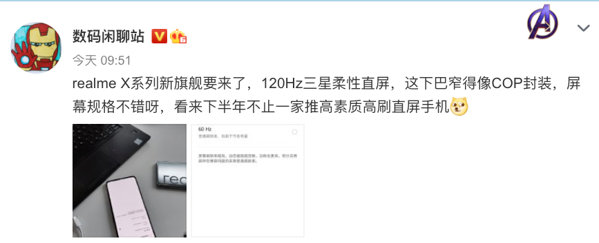 爆料显示realme新机采用120Hz三星柔性直屏,下巴很窄,提供60和120Hz两个调节选项。巧的是工信部也出现了realme的一款新机,型号为RMX2176,一些细节和爆料吻合,应该就是同一款。
