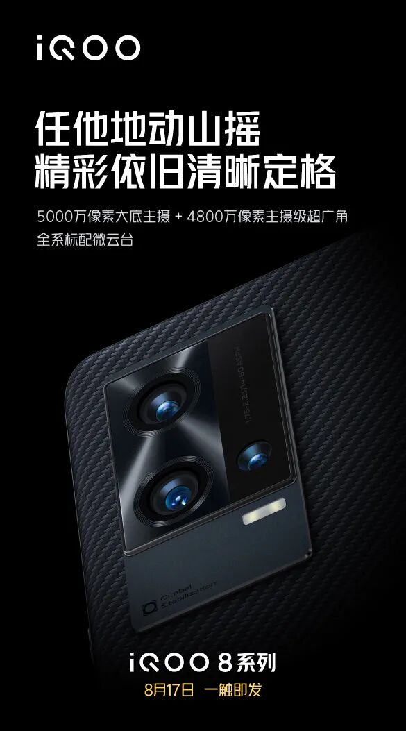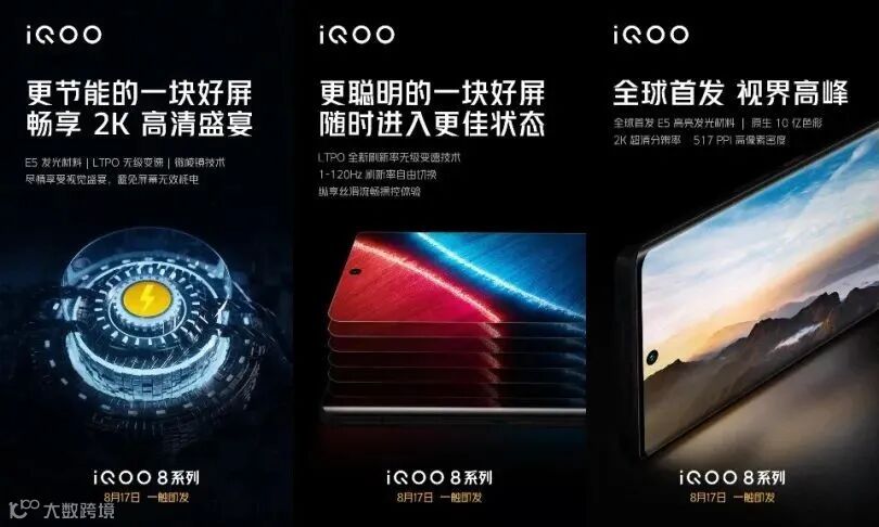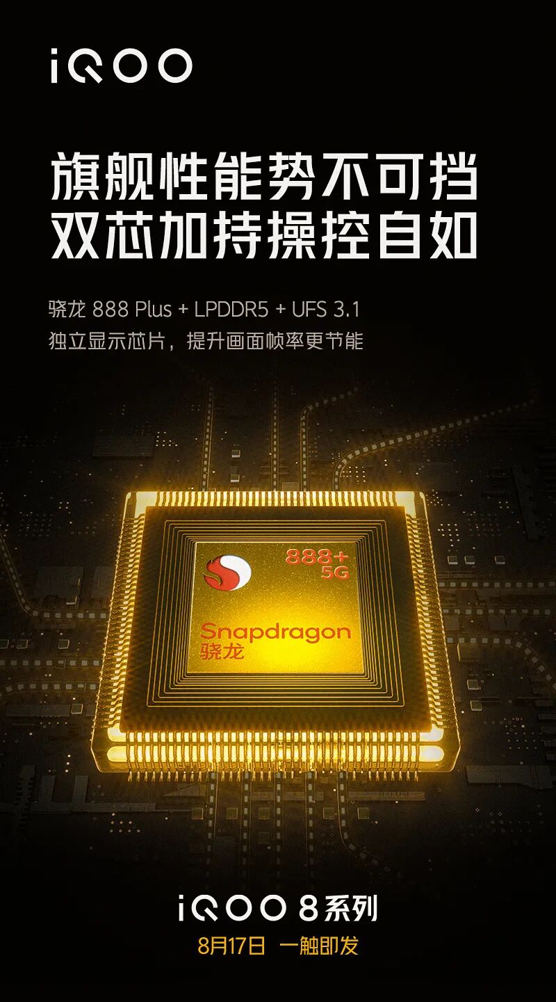 另据之前消息,iQOO 8系列参数有:首批搭载骁龙888 Plus+LPDDR5+UFS 3.1三件套,全系配备120W有线快充;iQOO 8 Pro全球首发三星E5发光材料、2K+分辨率、120Hz屏幕刷新率、原生10亿色彩、517PPI的居中单挖孔微曲面屏;iQOO 8则定制京东方柔性【直屏】,支持原生10bit色深、多档高刷。具体情况就等下周正式发布了。