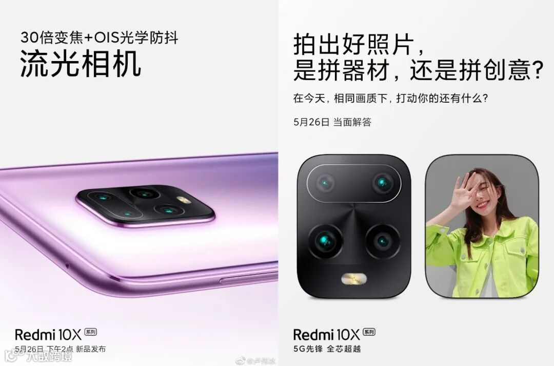 相机方面,官方晒出的预热海报显示后置四摄,和工信部的Redmi 10X 5G版三摄不同,所以猜测海报上应该是Redmi 10X Pro,其采用4800万像素主摄,官方表示支持30倍数字变焦,并保留ois光学防抖。