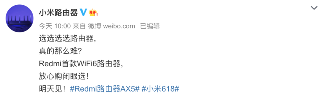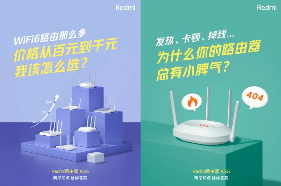 据官方预热,Redmi首款WiFi6路由器——Redmi路由器AX5将于明天和大家见面。前有329的小米WiFi6路由器(小米路由器AX1800),以Redmi的“极致性价比”宗旨来看,还是蛮期待Redmi这次的价格的~
