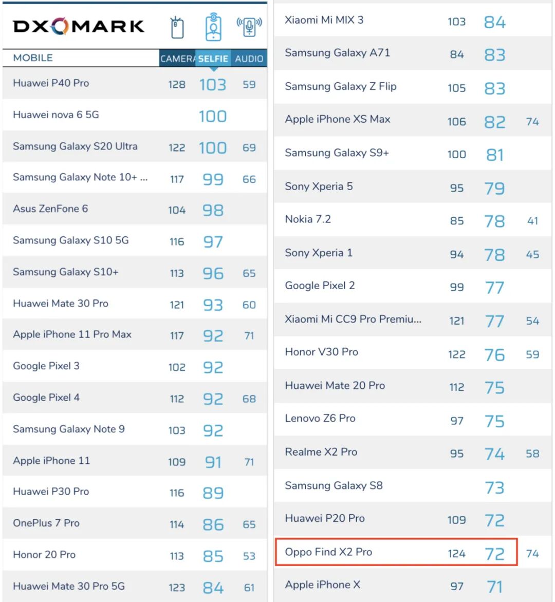 DxOMark表示OPPO Find X2 Pro前置相机综合成绩72分,位列倒数,分数比一众去年发布的机子低上许多分。