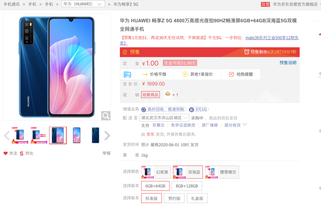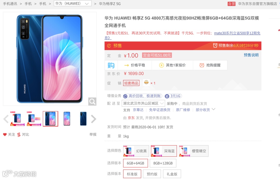 价格上,华为畅享Z 6+64GB售价1699元,6+128GB售价1899元,8+128GB售价2199元,目前在各大平台已经开启1元抵51元的预售活动,将于6月1日0点正式开卖。
