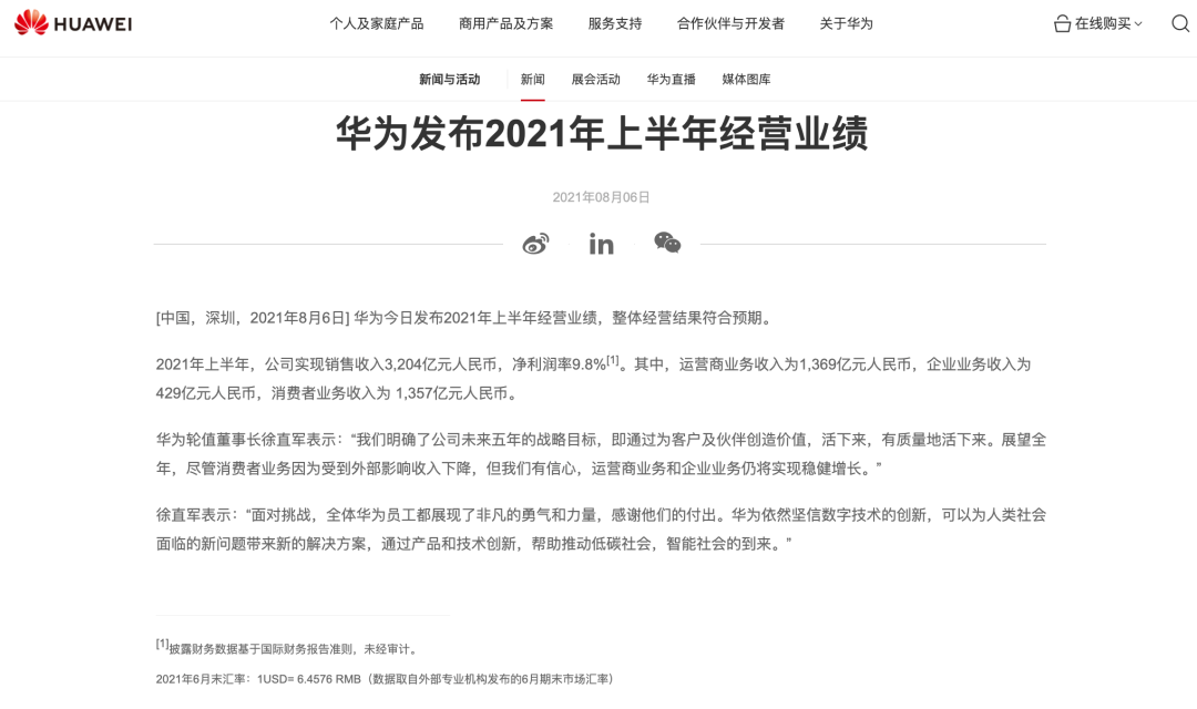 据8月6日华为发布的2021年上半年经营业绩显示,
