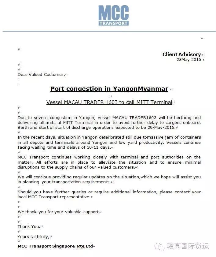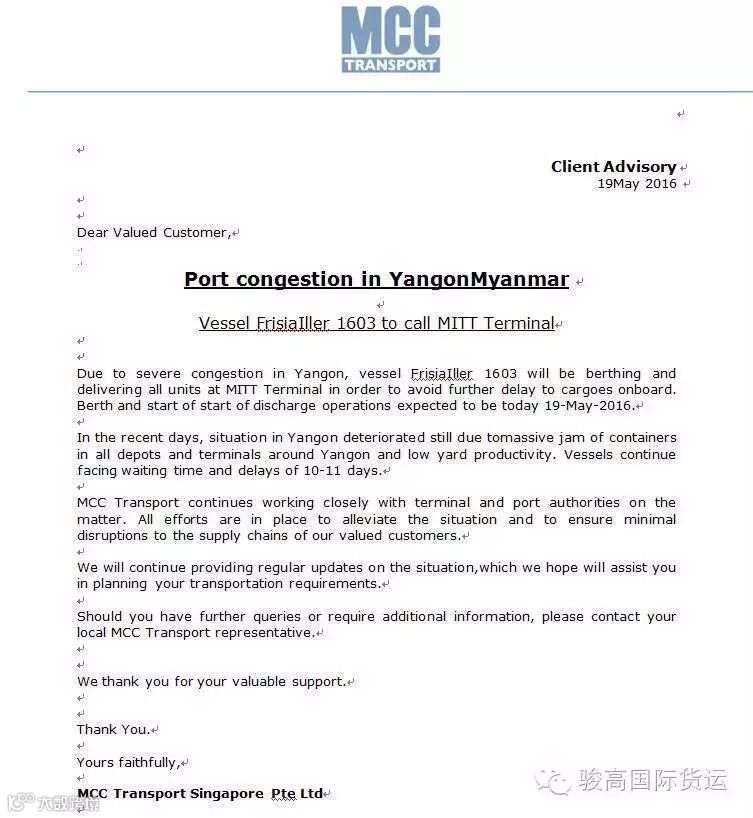 由于仰光MIP码头持续拥堵,近期所有船只在目的港都会压港10-11天以上。为保证客户的货物正常出运,Vessl FrisiaIller 1603 & Vessel Macau Trader 1603停靠MIP码头,转靠MITT码头,特此通知!附件为MCC官方通知,请大家注意!