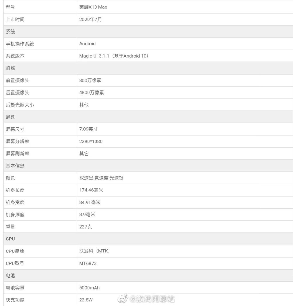 配置上,爆料称荣耀X10 Max采用7.09英寸2280*1080分辨率的水滴屏,提供探速黑、竞速蓝、光速银3个配色,机身三围174.46*84.91*厚8.9mm,重227g,搭载联发科MTK6873天玑800,支持双模5G,5000mAh+22.5W快充,前置8MP,后置48MP多摄。