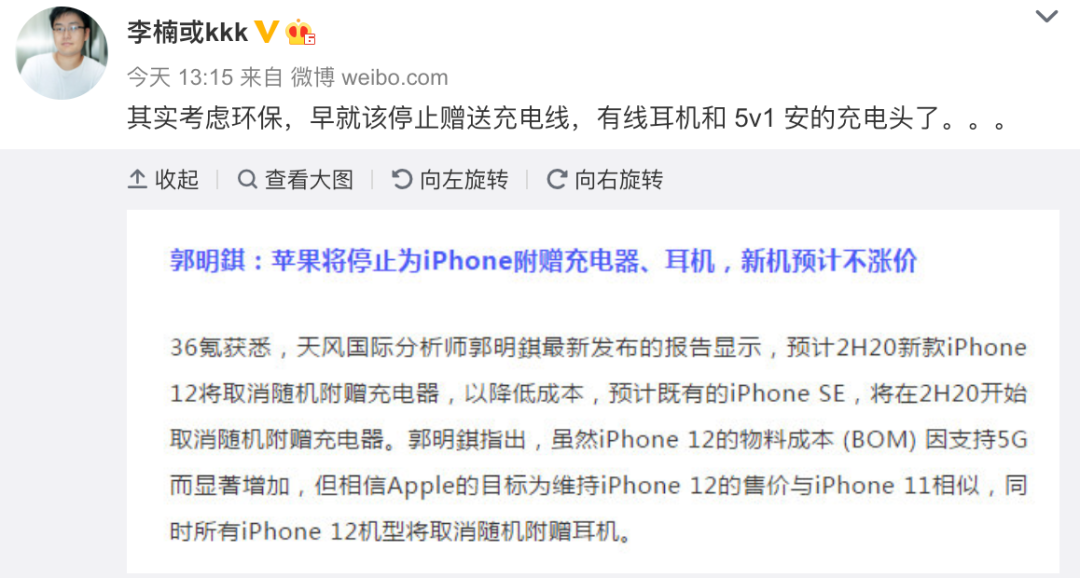 「其实考虑环保,早就该停止赠送充电线,有线耳机和5V/1A的充电头了。。。」一时间分不清这是反讽还是其他...