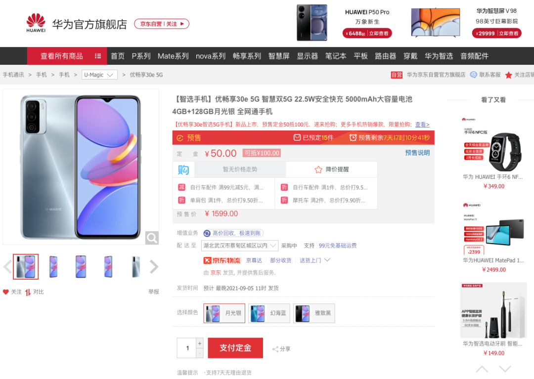 优畅享30e 5G仅提供一个版本 4+128GB售价1599元