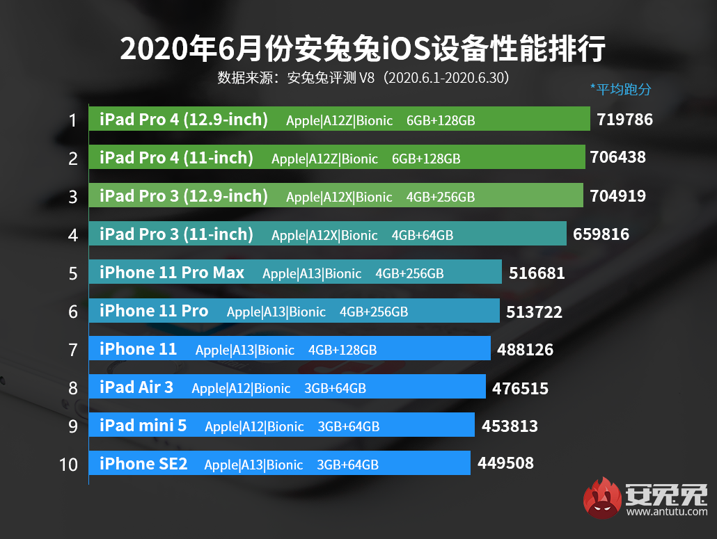 最后就是iOS设备这边,iPad Pro系列例行秒天秒地~ 随后就是搭载A13的iPhone 11系列,搭载A13的小屏iPhone SE2则位列第10名。