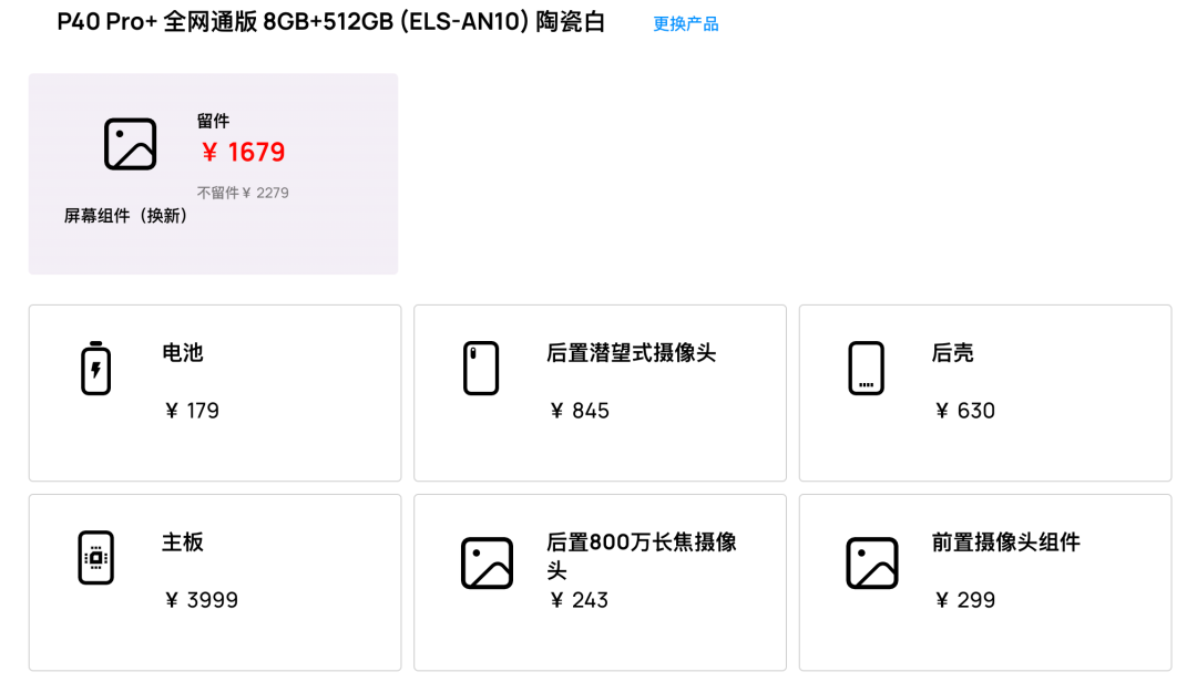 屏幕组件(留件)、主板、后盖、潜望式摄像头等维修价格则依次为
