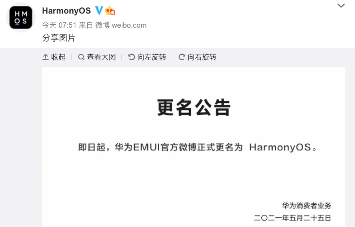 今天上午,华为EMUI官方微博宣布正式更名为HarmonyOS。
