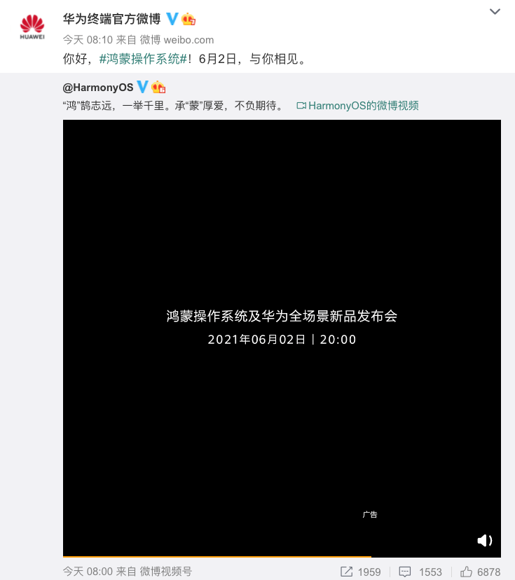 同时,华为官方还宣布鸿蒙操作系统及华为全场景新品发布会定档 6 月 2 日 20 点 (下周三晚上)。