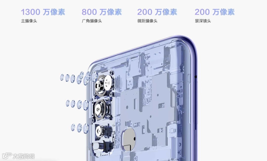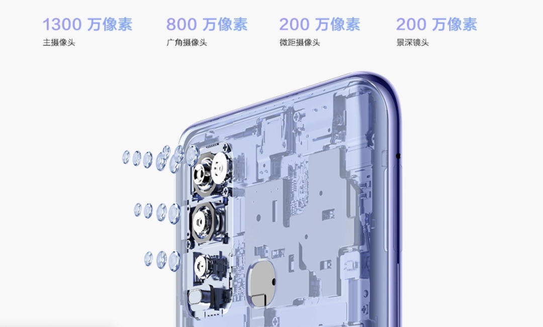 相机部分,vivo Y50前置1600万像素,后置矩形四摄 1300万主摄 F/2.2+800万超广角+200万微距+200万景深。此外,vivo Y50保留3.5mm耳机孔,type-C充电口,不支持NFC和无线充电。