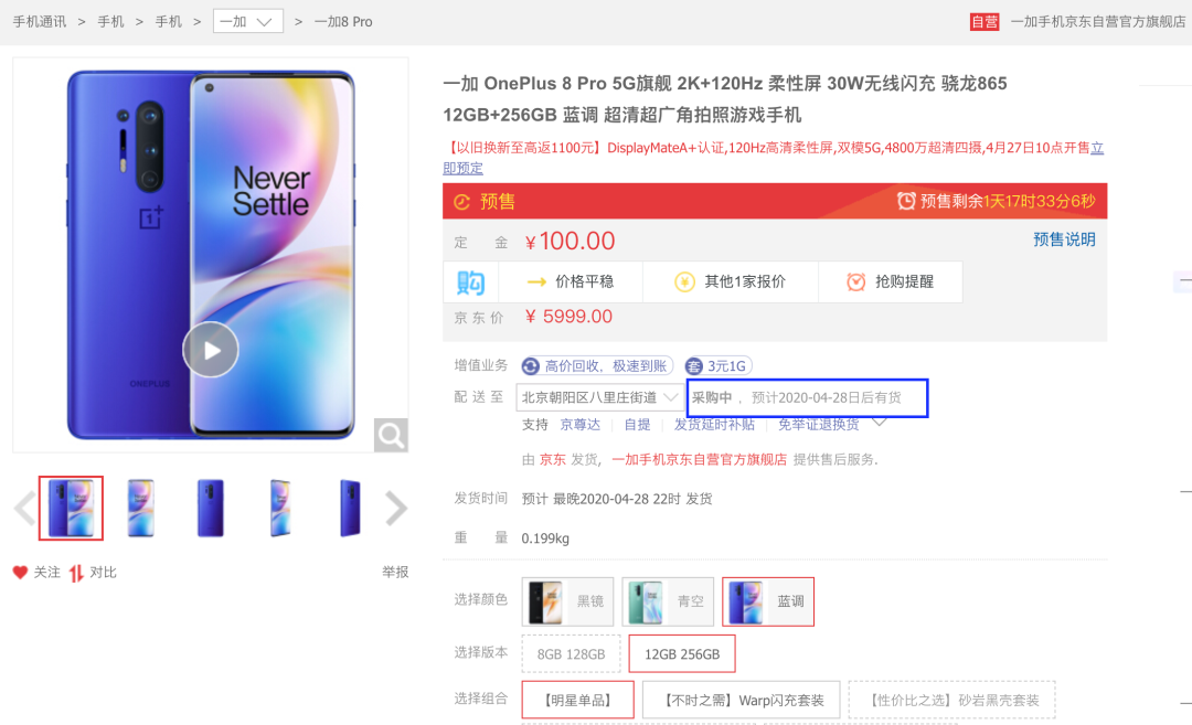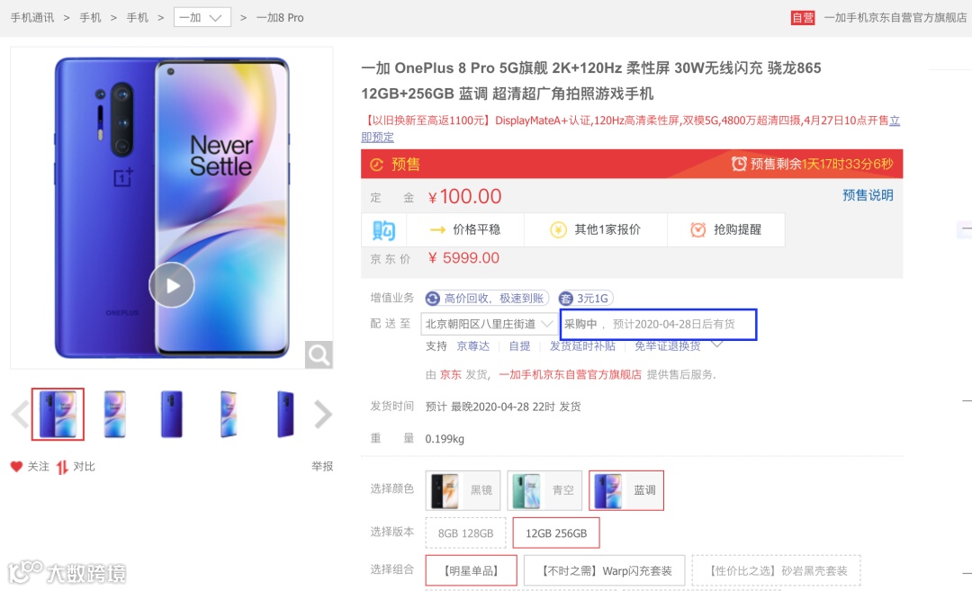 小白今天去京东查询发现确实如虎哥所说,一加8、一加8 Pro首销的青空、黑镜配色各个储存版本均出现无货状态,且未显示何时有货;不过一加8 Pro的限定色「蓝调」AG磨砂后盖悄然开启了预售,京东显示预计4月28日后有货,感兴趣的或许可以蹲一波了~