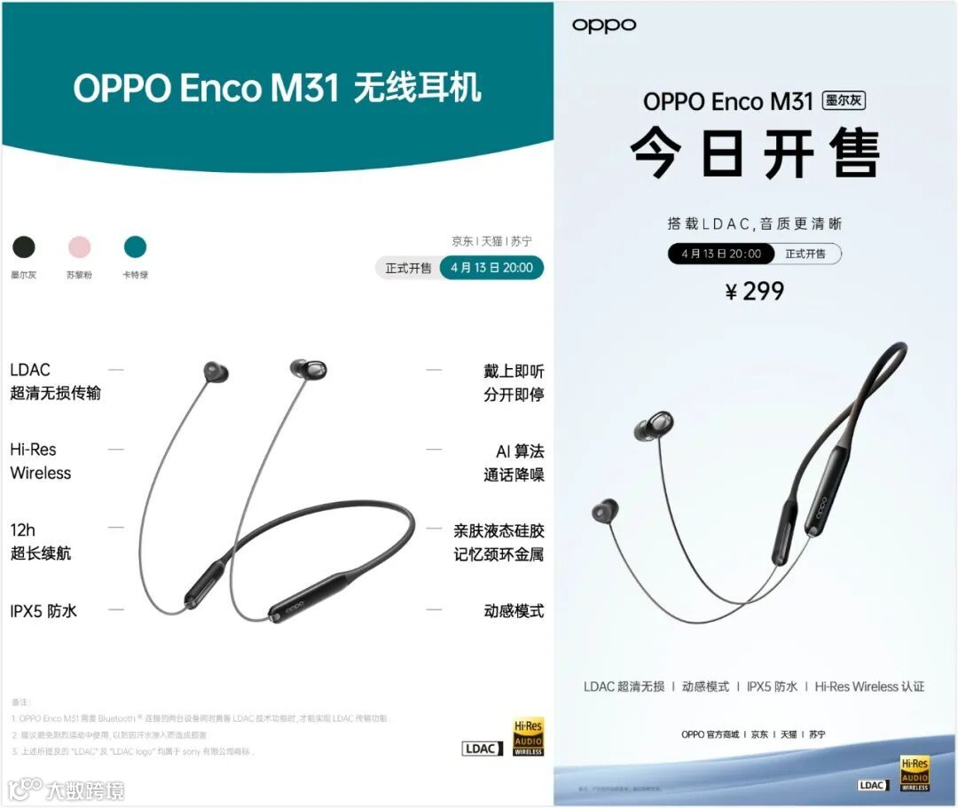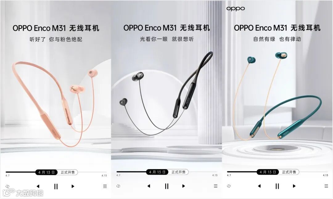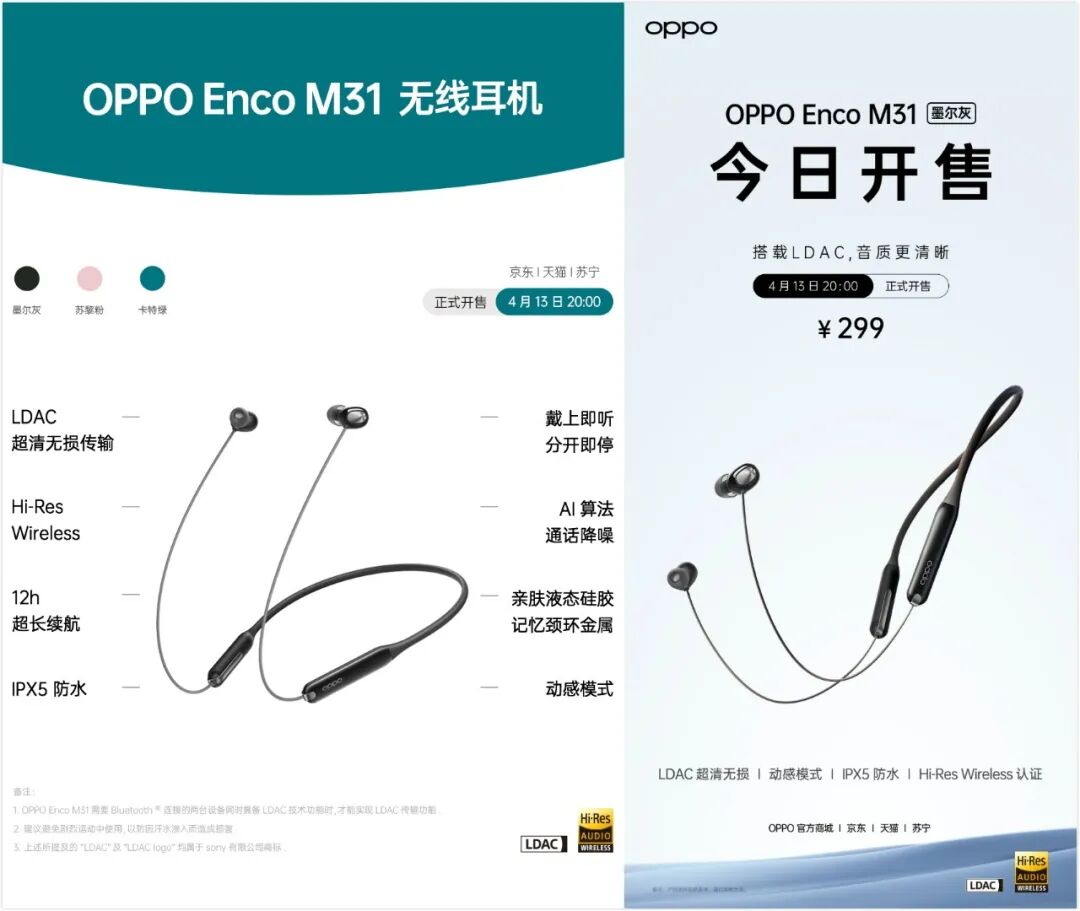 OPPO Enco M31全新挂颈式无线耳机,搭载 LDAC ,主打更清晰的音质,12小时超长续航,Hi-Res Wireless认证,提供墨尔灰、苏黎粉、卡特绿3个颜色。
