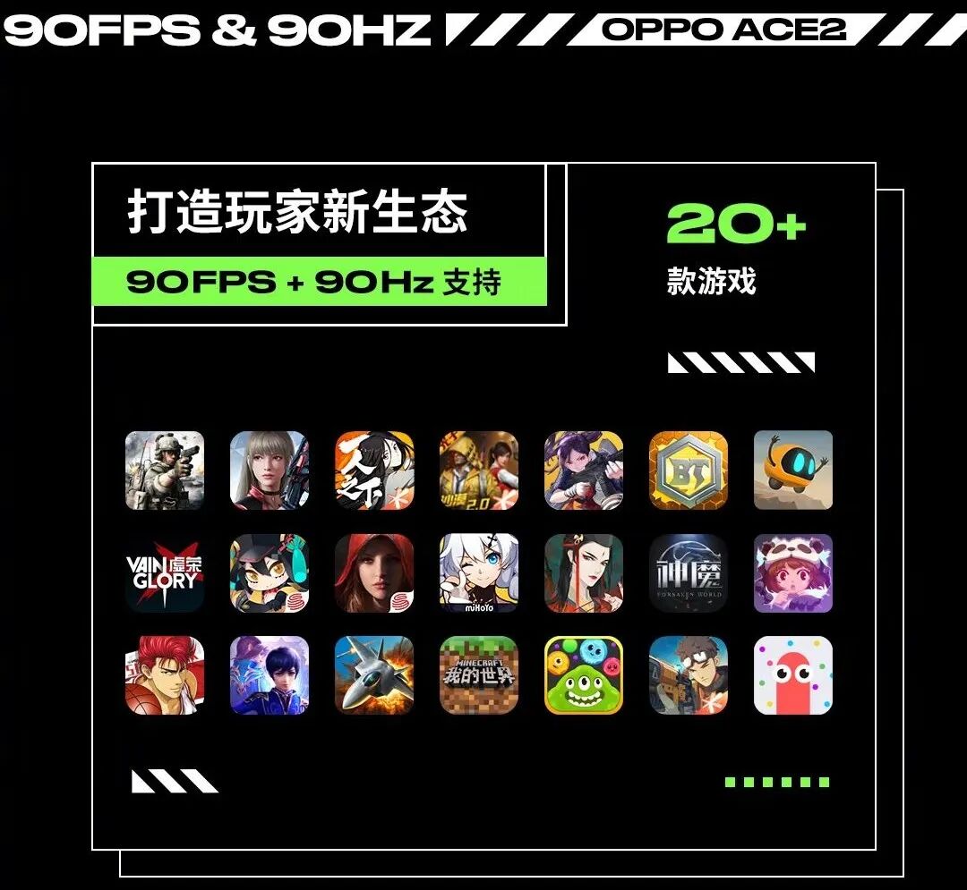 值得一提的是,OPPO Ace2也是今年新旗舰中少有的90Hz直屏,而且是单挖孔直屏,针对90Hz高刷,官方也表示目前已经适配超过20款高帧率游戏,包括《和平精英》《崩坏3》等等。