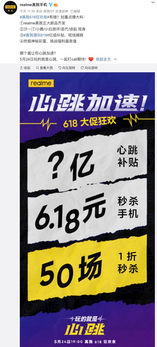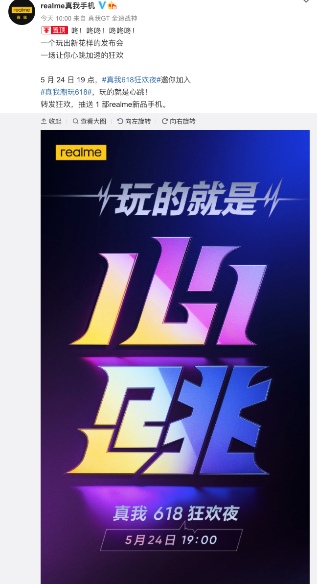 realme 618狂欢夜官宣定档:5 月 24 日下周一晚 19 点,不出意外应该也会来几个新品
