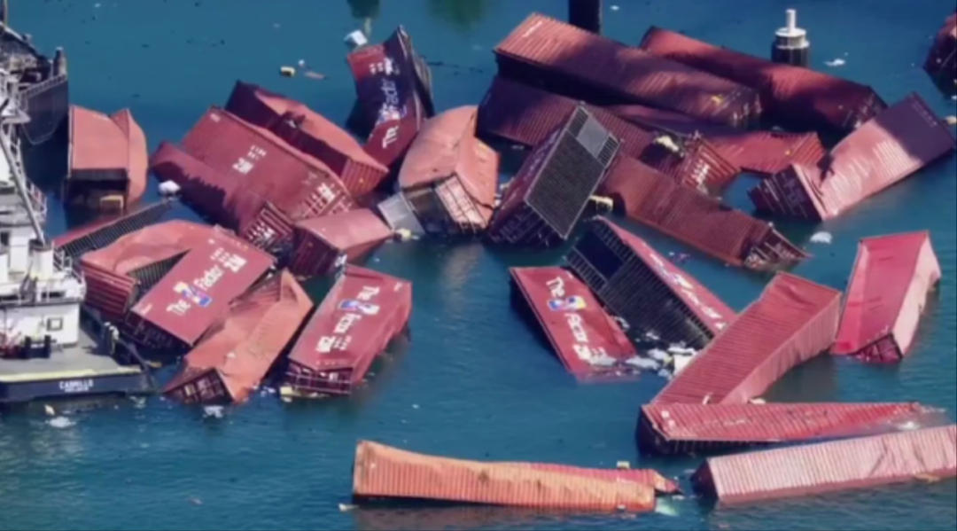 媒体航拍画面显示,大量集装箱散落在海面,部分压倒在小型船只上。甚至可见鞋类、服装等消费品漂浮在水中。