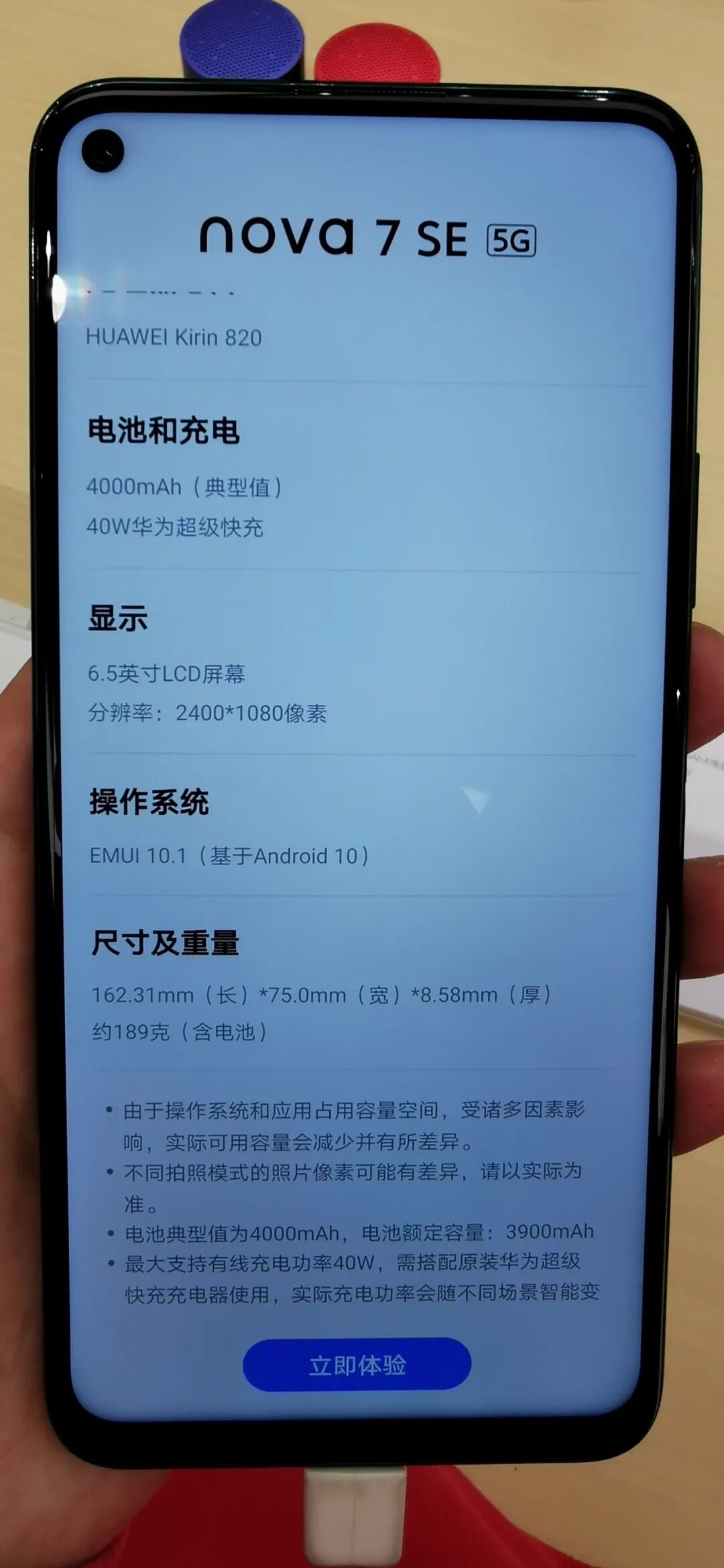 首先是华为Nova 7SE采用6.5英寸2400*1080分辨率的LCD屏,左上角单挖孔,侧边实体指纹,下巴有一丢宽,机身三围162.31*75*8.58mm,重189g,提供幻夜黑、绮镜森林、仲夏紫、银月星球4个配色,8+128GB、8+256GB两个储存规格。