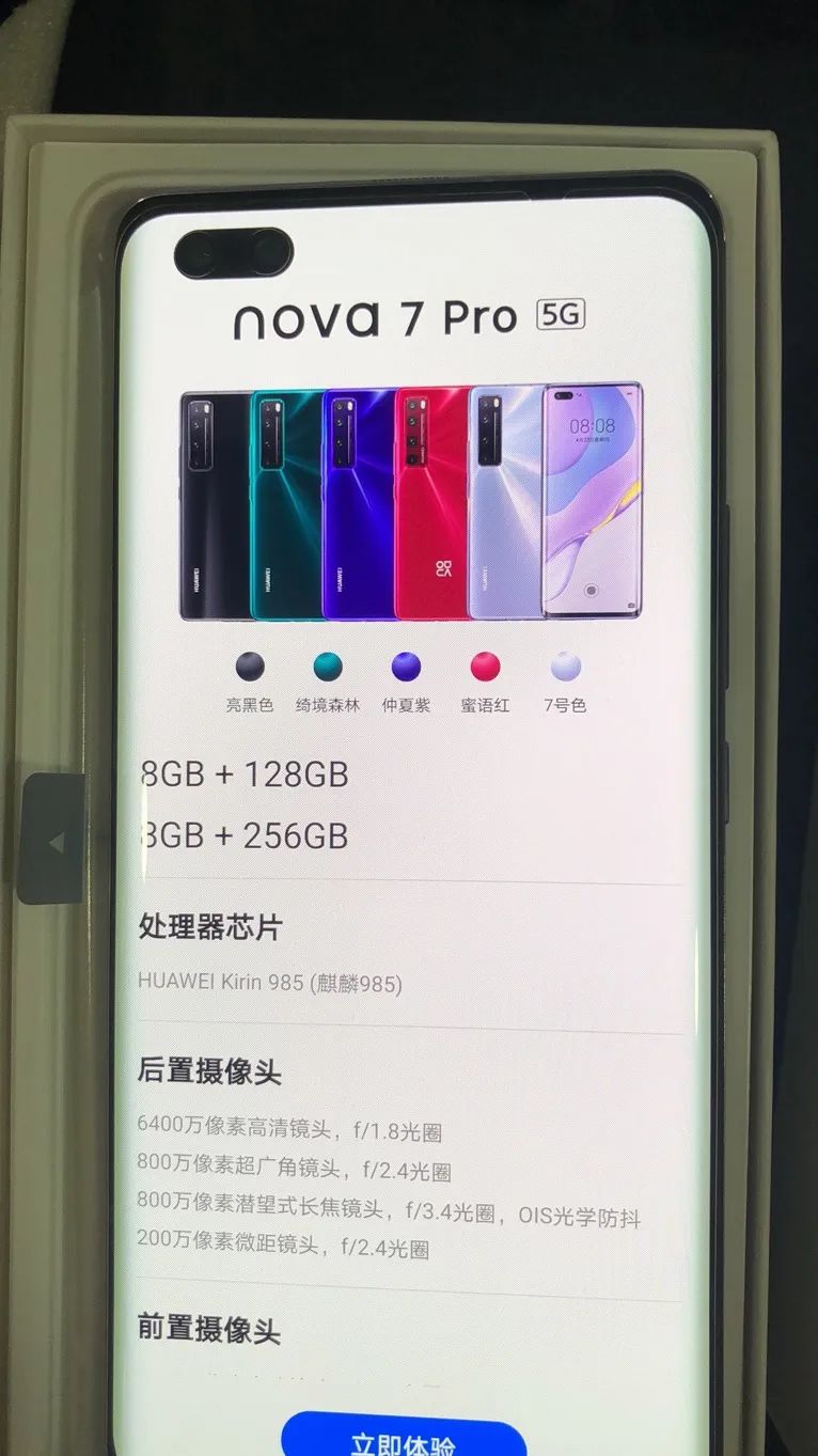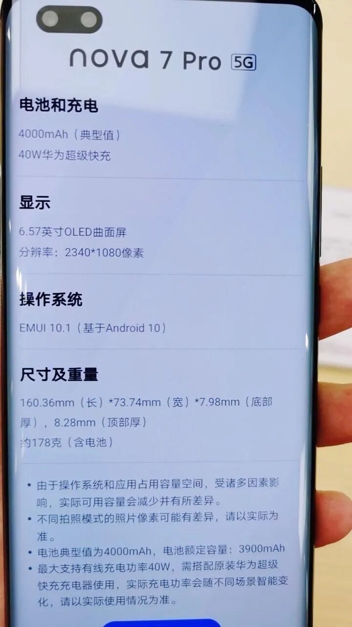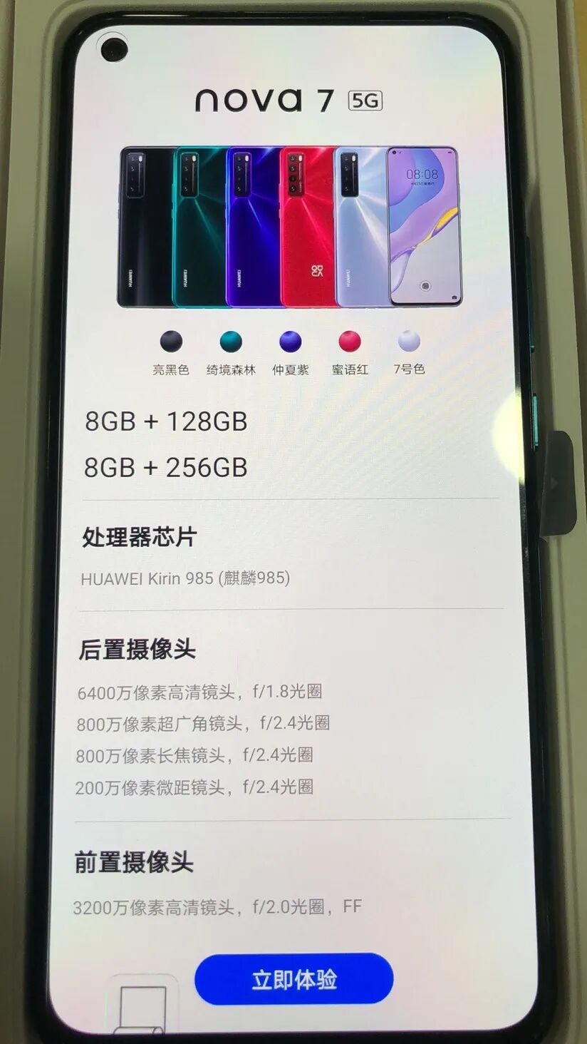 华为Nova 7采用6.53英寸2400*1080分辨率的单挖孔屏,直屏,OLED屏+屏幕指纹,机身三围160.64*74.33*7.96mm,重180g,无高刷,提供幻夜黑、绮镜森林、仲夏紫、银月星球、7号色 5个配色,8+128GB、8+256GB两个储存规格。