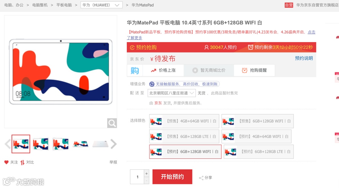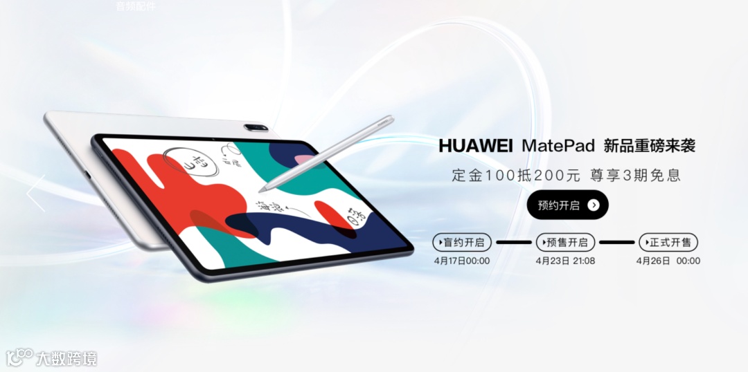 据华为商城、京东华为自营旗舰店显示,新款华为MatePad平板电脑已经于4月17日0点上架开启盲约,将于4月23日21:08正式开启预售,部分平台还预热了订金100可抵200的预定活动,将于4月26日0点正式开售。