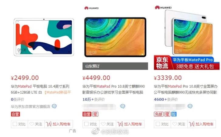 价格上,据爆料,华为新款MatePad平板电脑6+128GB Wi-Fi版售价为2099元,6+128GB全网通版售价为2499元,另外还有一个4+64GB WiFi版,起步价可能是1799元左右?
