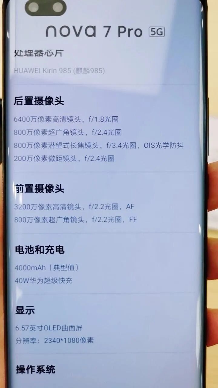 核心配置上,华为Nova 7搭载麒麟985,支持双模5G,前置3200万像素 F/2.0,后置四摄6400万像素 F/1.8+800万超广角 F/2.4+800万长焦 F/2.4+200万微距 F/2.4,4000mAh,40W有线快充。