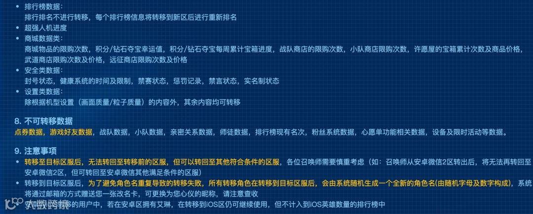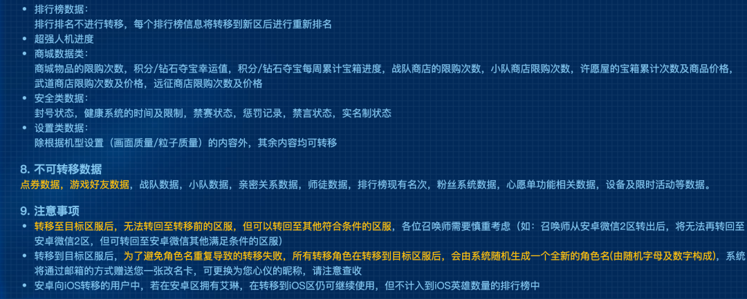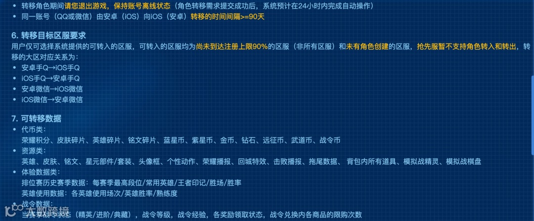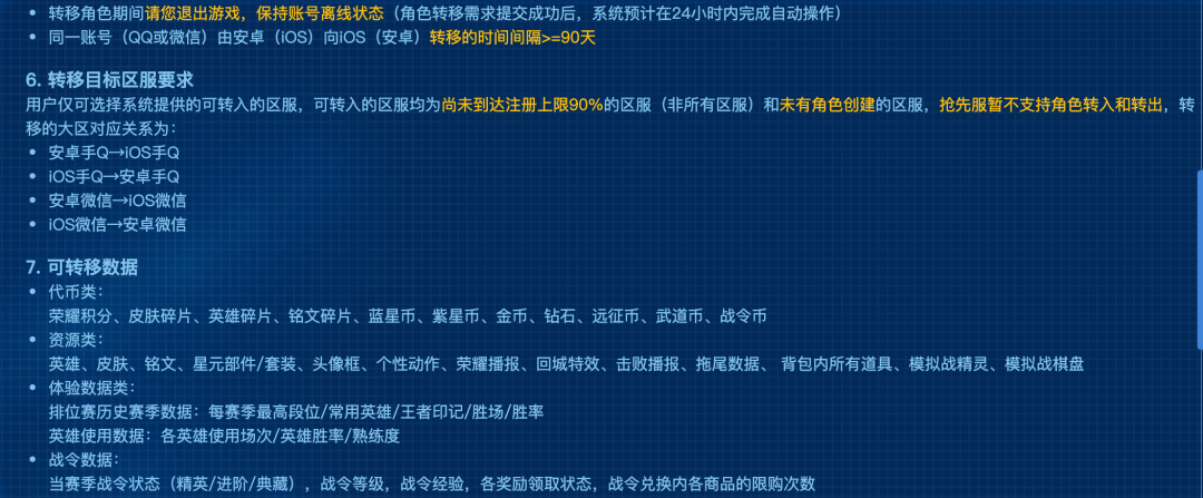 ⑥转移角色需不在小队或所在小队仅有该角色一人⑦转移角色期间请您退出游戏,保持账号离线状态⑧同一账号(QQ或微信)由安卓(苹果)向苹果(安卓)转移的时间间隔≥90天⑨抢先服暂不支持角色转入和转出。等等。