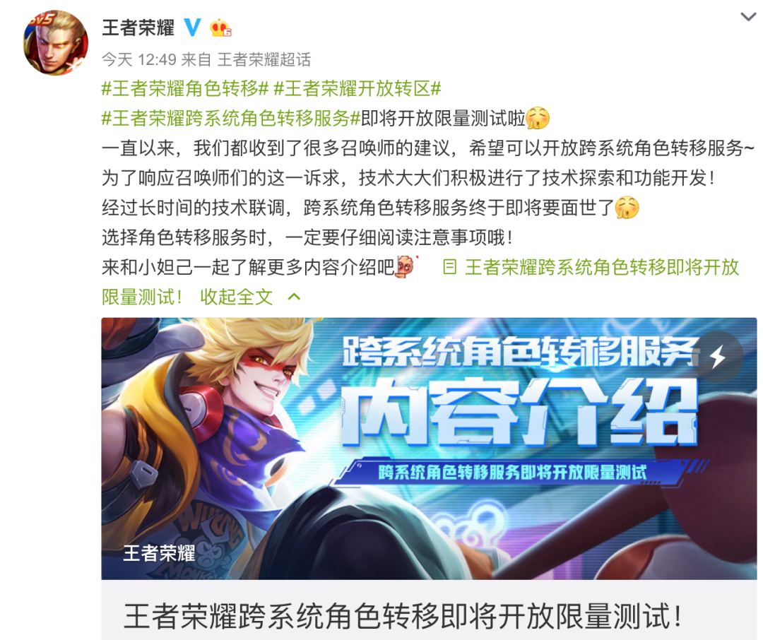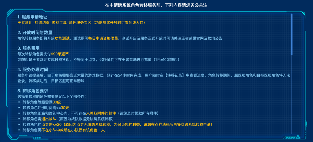 官方预告测试期间,在王者营地-战绩切页-游戏工具-角色服务专区 申请该项服务,测试期间每日申请资格限量,每次转移角色需支付990荣耀币(折合人民币99元)。