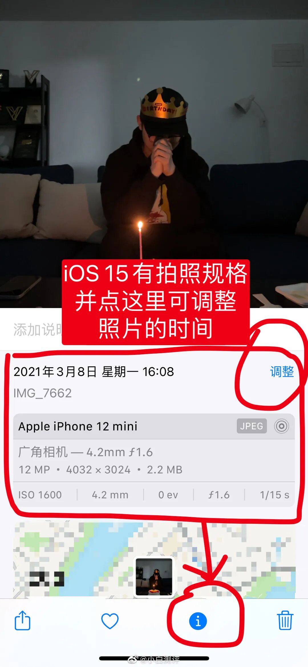 以直接在相册查看照片的所有信息Exif,包括拍摄机型/拍照参数光圈等细节(从前iOS 14.6上滑仅可查看拍摄位置),而且「iOS 15可以直接修改拍摄照片的时间」等,如果是从其他平台存取的照片,有些也会显示照片的Exif。