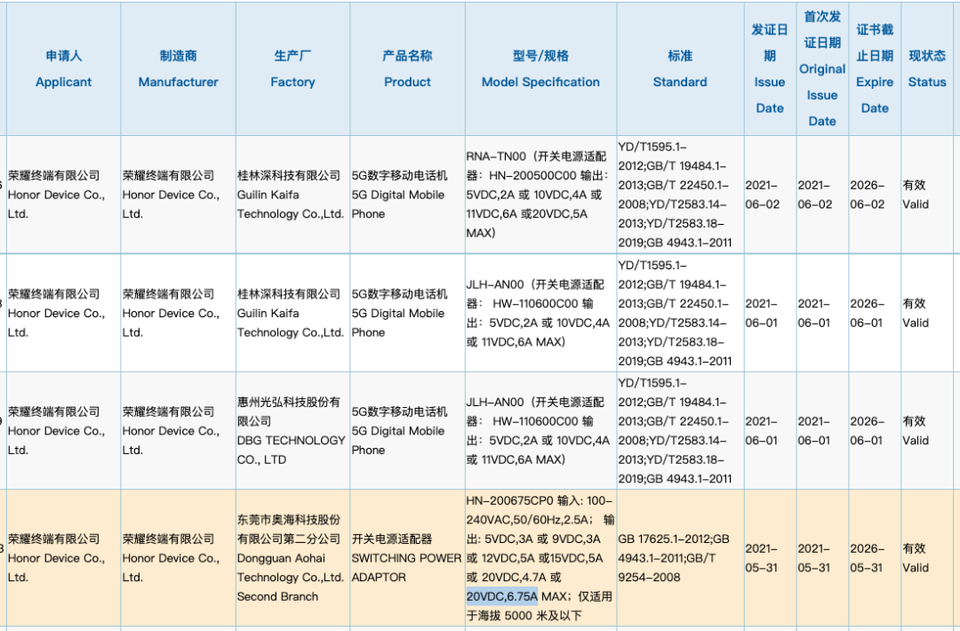 另一边,荣耀50/Pro算是基本确认分别配备66W快充和100W快充了,至于前几天现身3C认证的135W电源适配器个人猜测应该和华为哪款135W充电器差不多,为笔记本而生,但同时兼容华为荣耀的快充和PD协议,具体如何就等正式发布了。