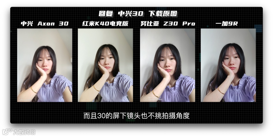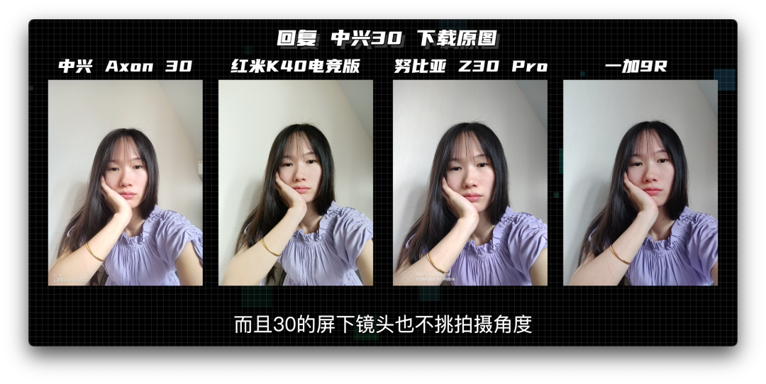与市面上常规手机的前置自拍相比,已经没什么太大区别了,而且中兴Axon 30的屏下前置镜头也不挑拍摄角度,感觉中兴完全可以直接默认开启这个开关啊。(*用于对比的4台手机前置均为1600万像素)