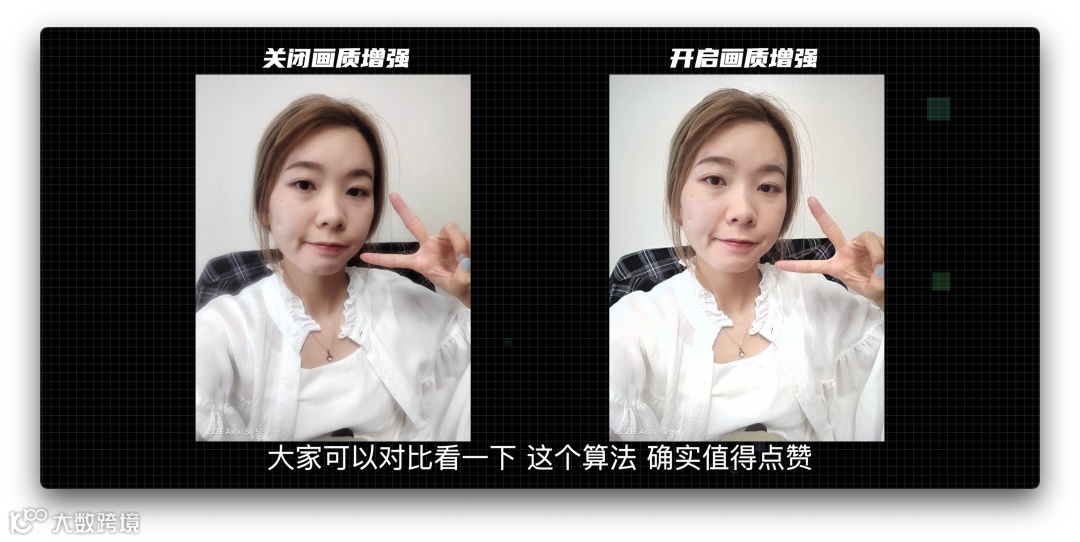 再实测下前置拍照表现,打开前置相机、取景框内的人物边缘有一圈光晕感,在不开启画质增强的时候拍出的照片确实有些模糊,但开启画质增强的开关后,照片提升非常明显,大家可以对比下这个算法~