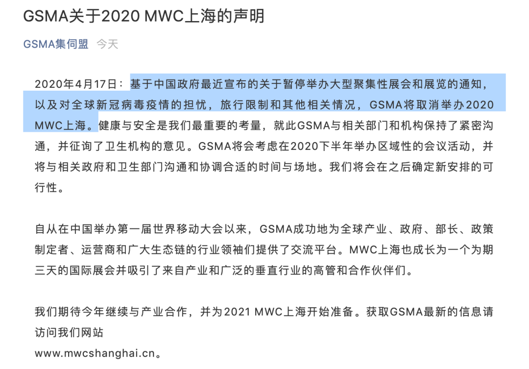 GSMA宣布,受疫情等因素影响,原定于 6 月举办的 2020 MWC 上海大会将取消。