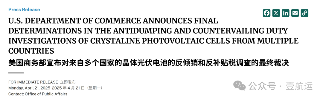 美东当地时间21日,美国商务部发布最新公告:宣布对包括柬埔寨、马来西亚、泰国和越南在内的东南亚四国晶体光伏电池(无论是否组装成组件)加征反倾销与反补贴税。