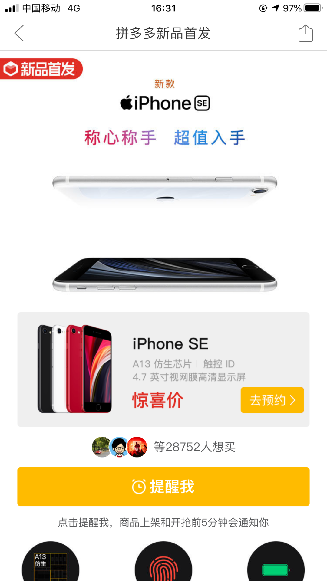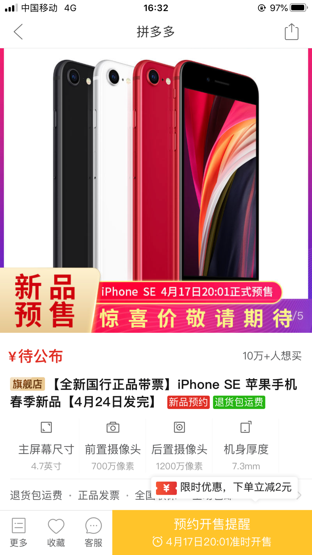 比如近两年都被大家称赞 百亿补贴真香 的 拼多多,其预告今晚20:01揭晓iPhone SE 2惊喜价,感兴趣的小伙伴可以蹲一波。 特别说明 本次拼多多活动非恰饭 仅分享请自行考虑风险毕竟非官方渠道