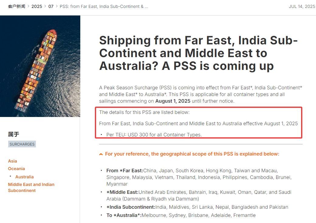 赫伯罗特宣布,从远东 、印度次大陆和中东到澳大利亚的旺季附加费(PSS)即将生效。本PSS适用于所有集装箱类型,2025年8月1日开始直至另行通知。每TEU:所有集装箱类型300美元。详情如下: