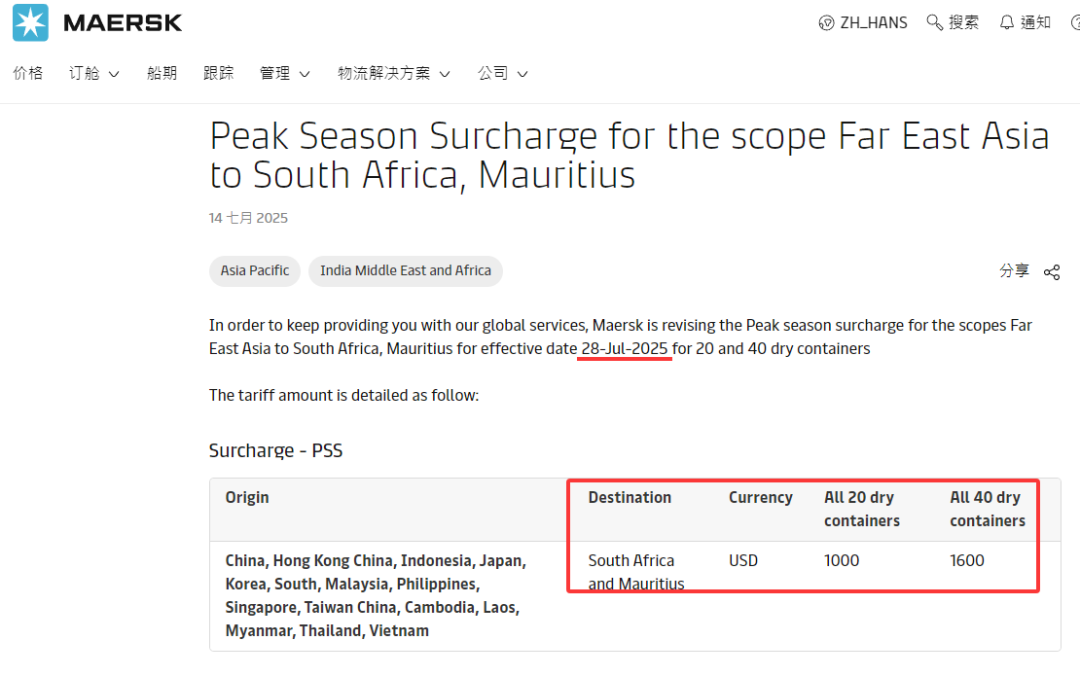 马士基将于2025年7月28日对中国、中国香港等至南非/毛里求斯航线的所有20&40英尺干货集装箱,调整征收旺季附加费PSS。征收标准:20英尺箱1000美金,40英尺箱征收1600美金。详情如下: