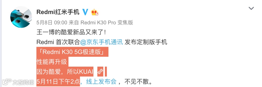 至于价格方面,目前Redmi K30 5G 6+128GB版目前已降到1999元,鉴于这次「Redmi K30极速版」是和京东独家合作,所以5G频段应该会得到丰富,价格应该升级不升价,可能还是1999左右?🤔明天下午2点发布,预计5月14日正式首销。