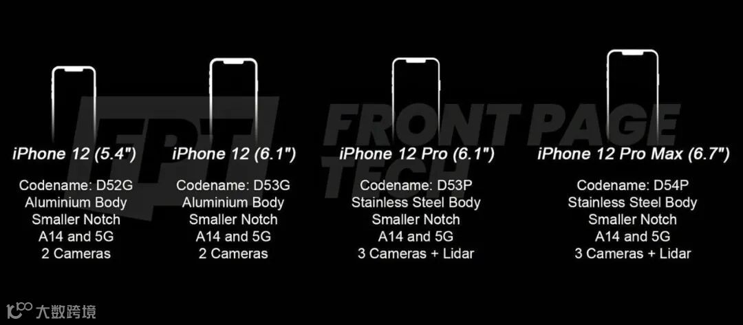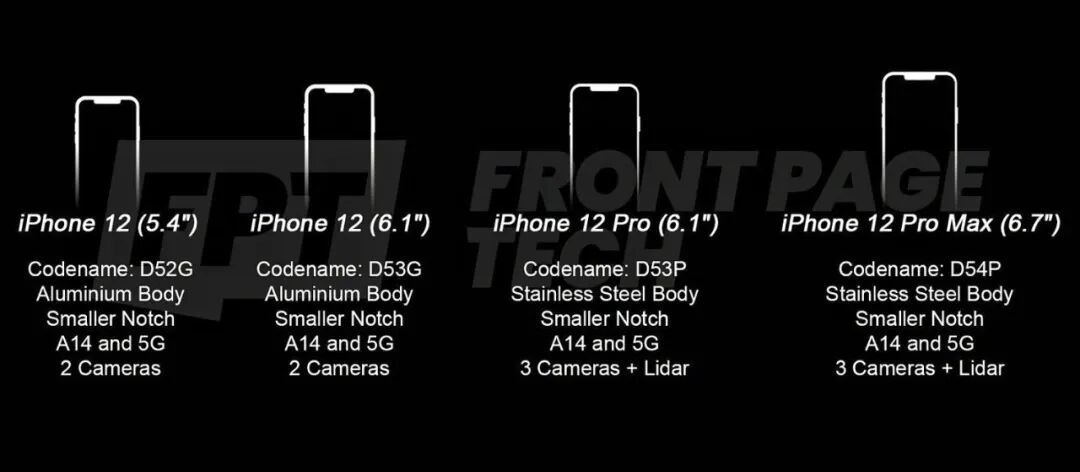 据之前消息,iPhone 12系列将带来4款机型,分别是:5.4英寸iPhone 12、6.1英寸iPhone 12 Max、6.1英寸iPhone 12 Pro、6.7英寸iPhone 12 Pro Max ,均采用刘海屏(有缩窄),搭载5nm工艺的A14处理器,全系支持5G。