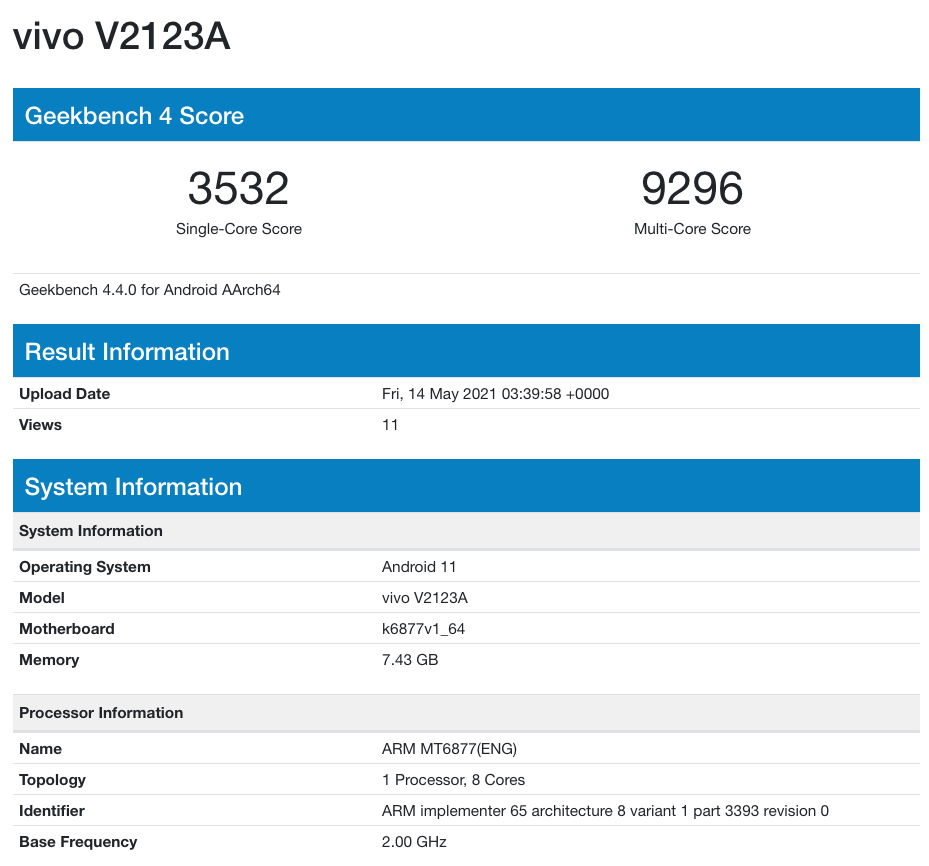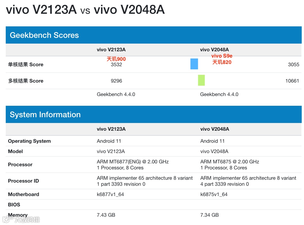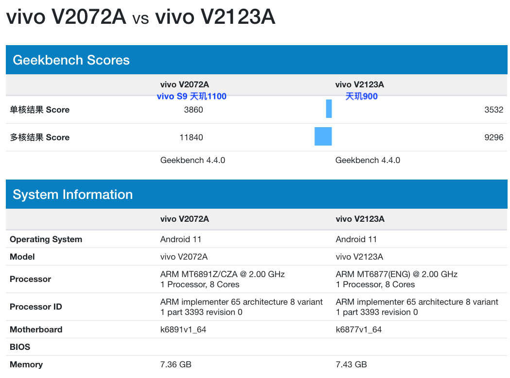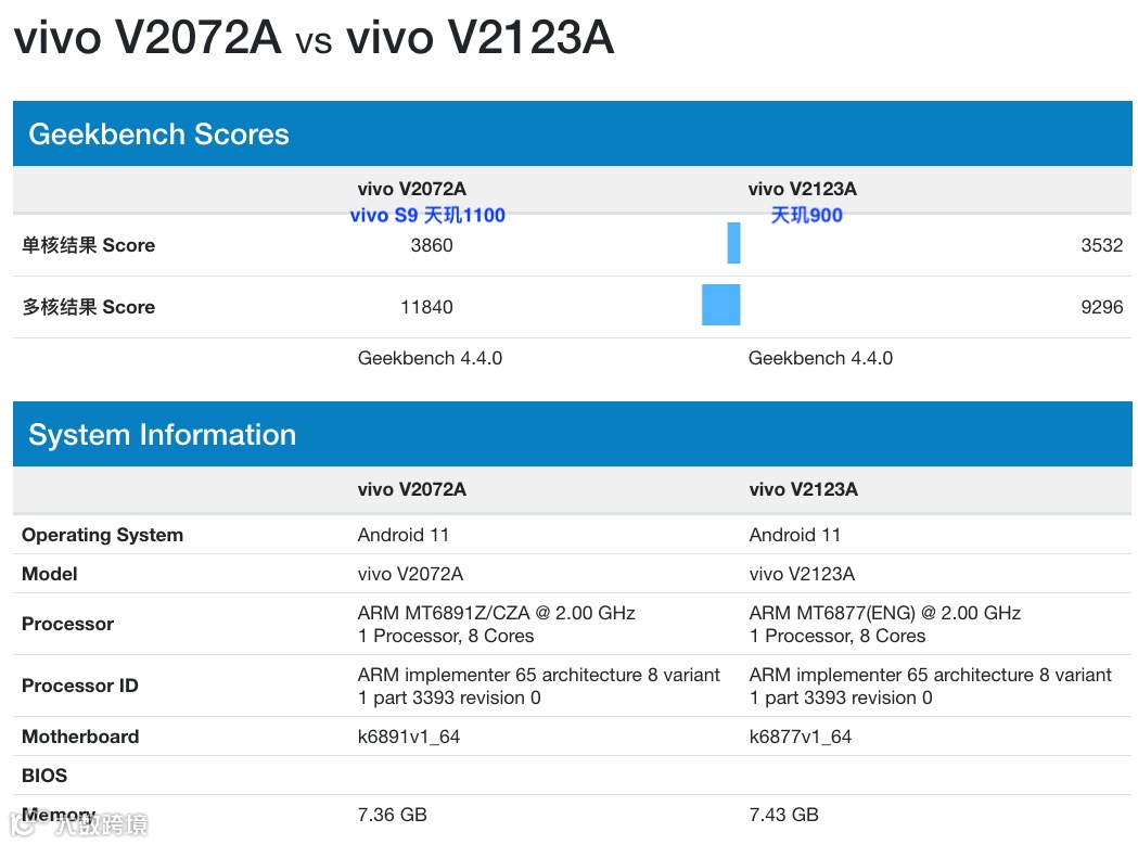 如上图所见,型号为V2123A的vivo新机现身Geekbench 4跑分库搭载的正是刚发布的联发科天玑900,内置8GB 运行Android 11,Geekbench 4单核跑分3532 多核跑分9296。暂时不清楚对应的是vivo哪款机型,但之前天玑用的比较多的还是S系列。
