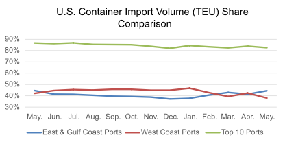 美东和美湾港口市场份额仍超过美西港口,且差距扩大
