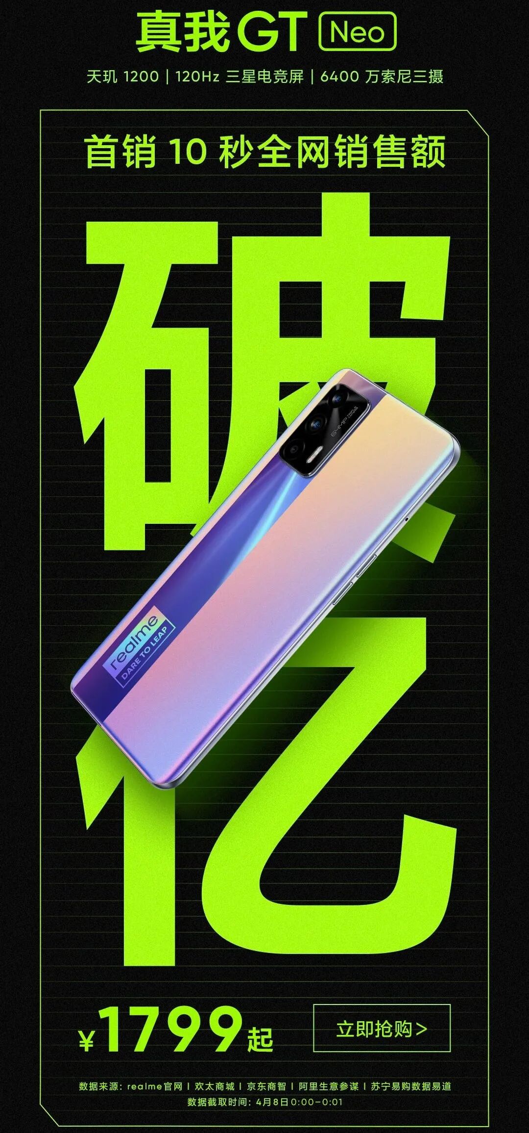 3月份最后一天,realme发布了真我GT Neo,其也算是截胡Redmi首发联发科天玑1200处理器,今天0点真我GT Neo正式首销,官方也在第一时间公布了首销战报。
