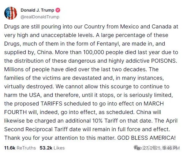 为何突然又狮子大开口?特朗普给出的理由是:毒品。特朗普当天在社交平台上发文称,从加拿大和墨西哥涌入美国的毒品数量“多到令人无法接受”,其中很大一部分是致命的阿片类药物芬太尼,“并由中国提供”,去年有超过10万人因为这些毒品而死亡。