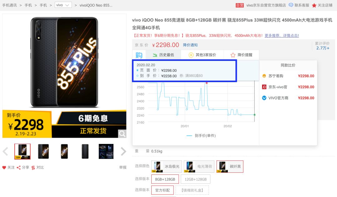 此外 ,发布于2019年12月5日的iQOO Neo 855Plus版近日也进行了降价促销,8+128GB到手价2298元。